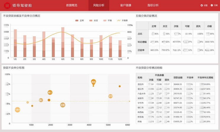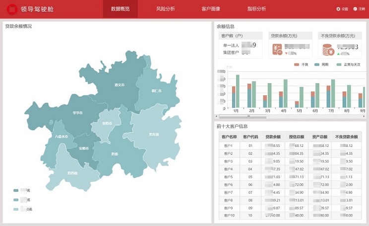 系統(tǒng)覆蓋了客戶風險月報的常用固定報表、分析報表、綜合查詢、等業(yè)務需求;同時為了滿足各級領(lǐng)導快速直觀地了解掌握全行客戶風險情況的需要,開發(fā)實現(xiàn)了領(lǐng)導駕駛艙功能;為了滿足業(yè)務人員能夠靈活便捷地對財政收支數(shù)據(jù)進一步分析,開發(fā)實現(xiàn)了自助分析功能。