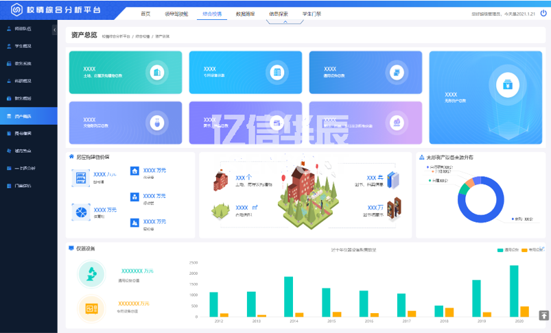 強(qiáng)化資產(chǎn)管理是推進(jìn)預(yù)算制度改革的重要內(nèi)容,也是部門預(yù)算有效執(zhí)行的重要保證。資產(chǎn)概括頁面通過分析學(xué)校各類型資產(chǎn)的存量和分布情況,可以提高資產(chǎn)的利用率,從而指導(dǎo)探索進(jìn)一步管好用好高校資產(chǎn)的方法與途徑。如下圖: