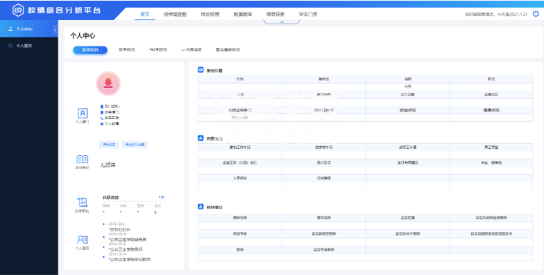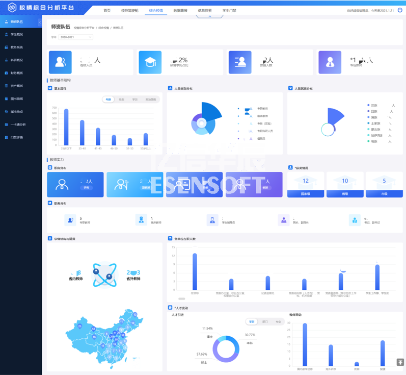 高校師資隊(duì)伍建設(shè)的優(yōu)劣決定了高校人才培養(yǎng)質(zhì)量的高低。如何在大數(shù)據(jù)時(shí)代科學(xué)利用源于高校各個(gè)層面的海量數(shù)據(jù),并使之成為高校師資隊(duì)伍建設(shè)的參考與方向,是眾多高校需要解決的問題。師資隊(duì)伍頁面通過展現(xiàn)教職工主要的屬性指標(biāo),分析了目前高校師資隊(duì)伍建設(shè)中所存在的問題,對(duì)加強(qiáng)高校師資隊(duì)伍建設(shè)起到指導(dǎo)作用。如下圖: