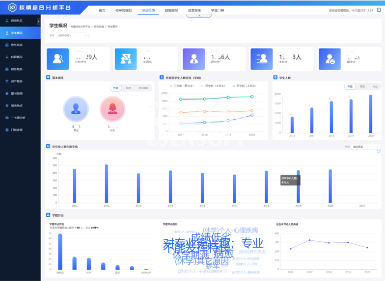 陜西中醫(yī)藥大學(xué)數(shù)據(jù)分析平臺(tái)項(xiàng)目建設(shè)是將陜西中醫(yī)藥大學(xué)數(shù)據(jù)以各種圖表等形式在平臺(tái)上展示,可直觀地掌握學(xué)校信息的情況,通過統(tǒng)計(jì)不同維度來分析不同的問題。平臺(tái)為信息資源整合共享奠定基礎(chǔ),為學(xué)院教學(xué)、科研、管理和服務(wù)提供統(tǒng)一、規(guī)范、準(zhǔn)確、實(shí)時(shí)的權(quán)威數(shù)據(jù)服務(wù),并為今后的數(shù)據(jù)挖掘和科學(xué)決策提供可靠的依據(jù)。
