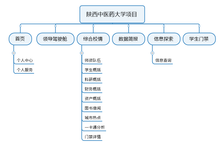 陜西中醫(yī)藥大學(xué)數(shù)據(jù)分析平臺(tái)項(xiàng)目,涉及內(nèi)容包括首頁、領(lǐng)導(dǎo)駕駛艙、綜合校情、數(shù)據(jù)簡報(bào)、信息探索和學(xué)生門禁等各項(xiàng)內(nèi)容。平臺(tái)項(xiàng)目功能架構(gòu)圖如下: