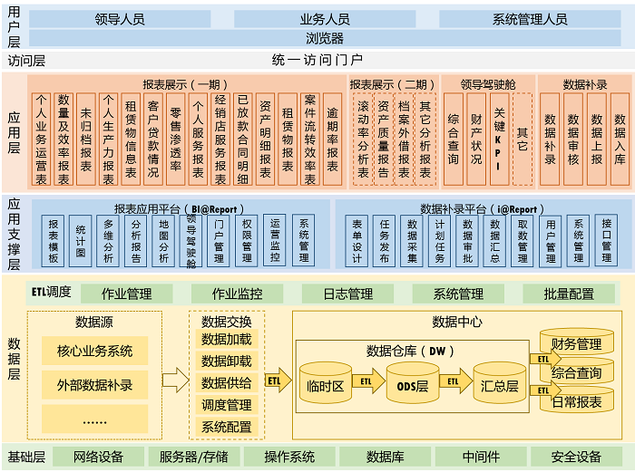 基于對業(yè)務(wù)數(shù)據(jù)的匯總、加工等數(shù)據(jù)模型設(shè)計(jì),在成熟的數(shù)據(jù)采集產(chǎn)品和數(shù)據(jù)補(bǔ)錄軟件平臺(tái)的基礎(chǔ)上構(gòu)建了數(shù)據(jù)展現(xiàn)分析模塊、數(shù)據(jù)補(bǔ)錄報(bào)送模塊 、用戶權(quán)限管理模塊以及門戶配置模塊 。
