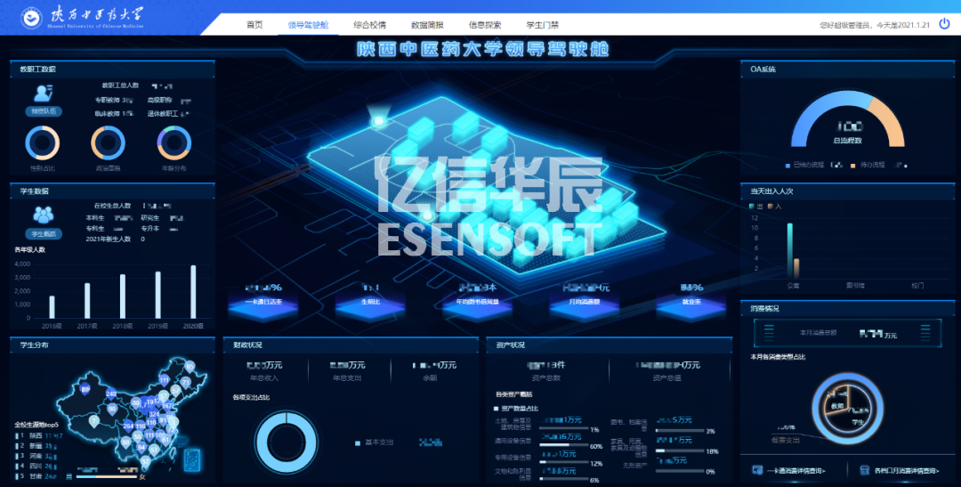 陜西中醫(yī)藥大學(xué)是一所以中醫(yī)藥專業(yè)為主體,醫(yī)、理、工、文、管多學(xué)科專業(yè)相互支撐、交叉融合的醫(yī)科類院校。其數(shù)字化工作一直走在高校前列,近年來啟動(dòng)智慧校園建設(shè)。但一直以來數(shù)據(jù)缺乏良好的展示平臺(tái),陜西中醫(yī)藥大學(xué)選擇與聯(lián)奕合作,利用數(shù)據(jù)分析軟件億信ABI有效打通信息收集和展示的鏈路,構(gòu)建一個(gè)可視化、自動(dòng)化的數(shù)據(jù)管理平臺(tái)。 那么,就具體的場景而言,一站式數(shù)據(jù)分析平臺(tái)億信ABI是怎么發(fā)揮作用的呢? 為什么需要數(shù)據(jù)化運(yùn)營 高校信息化的建設(shè)與發(fā)展不斷更新迭代,已形成了“人、財(cái)、物”為管理對(duì)象的各種業(yè)務(wù)管理系統(tǒng),也因此積累了海量的業(yè)務(wù)數(shù)據(jù)。但傳統(tǒng)的各業(yè)務(wù)系統(tǒng)建設(shè)或多或少都有各自的數(shù)據(jù)分析與展示后臺(tái),由于系統(tǒng)之間的壁壘,數(shù)據(jù)無法實(shí)時(shí)共享,導(dǎo)致數(shù)據(jù)的分析展示作用、查看權(quán)限受限。 智慧校園場景化落地實(shí)戰(zhàn) 陜西中醫(yī)藥大學(xué)利用億信ABI建設(shè)了統(tǒng)一的校情綜合分析平臺(tái),涉及內(nèi)容包括首頁、領(lǐng)導(dǎo)駕駛艙、綜合校情、數(shù)據(jù)簡報(bào)、信息探索和學(xué)生門禁等各項(xiàng)內(nèi)容。通過數(shù)據(jù)化運(yùn)營改進(jìn)數(shù)據(jù)收集和管理方式,用數(shù)據(jù)驅(qū)動(dòng)業(yè)務(wù),對(duì)業(yè)務(wù)數(shù)據(jù)進(jìn)行可視化分析,以提升學(xué)校管理水平和服務(wù)能力。 輕松整合異構(gòu)數(shù)據(jù)源 傳統(tǒng)的學(xué)校教務(wù)人員如果需要做數(shù)據(jù)分析,需要操作多個(gè)不同異構(gòu)系統(tǒng),不僅涉及系統(tǒng)繁多,工作量大,而且工作內(nèi)容復(fù)雜,差錯(cuò)容忍度低。單純依靠人工操作,不僅效率多,耗費(fèi)大量人力,還易產(chǎn)生數(shù)據(jù)誤差。億信ABI可從多個(gè)系統(tǒng)、數(shù)據(jù)源獲取數(shù)據(jù),支持多種數(shù)據(jù)庫連接,還可以輕松整合多個(gè)業(yè)務(wù)系統(tǒng)的數(shù)據(jù),打破信息孤島,進(jìn)行綜合展示分析,讓決策更清晰。 領(lǐng)導(dǎo)駕駛艙運(yùn)營管理多元化 領(lǐng)導(dǎo)駕駛艙以駕駛室的方式,根據(jù)詳細(xì)的評(píng)價(jià)指標(biāo)體系,將收集的數(shù)據(jù)信息根據(jù)各種各樣普遍的數(shù)據(jù)圖表(3D地圖、柱狀圖、折線圖、餅狀圖)藝術(shù)化、形象化、細(xì)化,即時(shí)體現(xiàn)學(xué)校運(yùn)作的重要指標(biāo)值,形象化的檢測學(xué)校運(yùn)行狀態(tài),供學(xué)校領(lǐng)導(dǎo)層按時(shí)匯報(bào)工作。