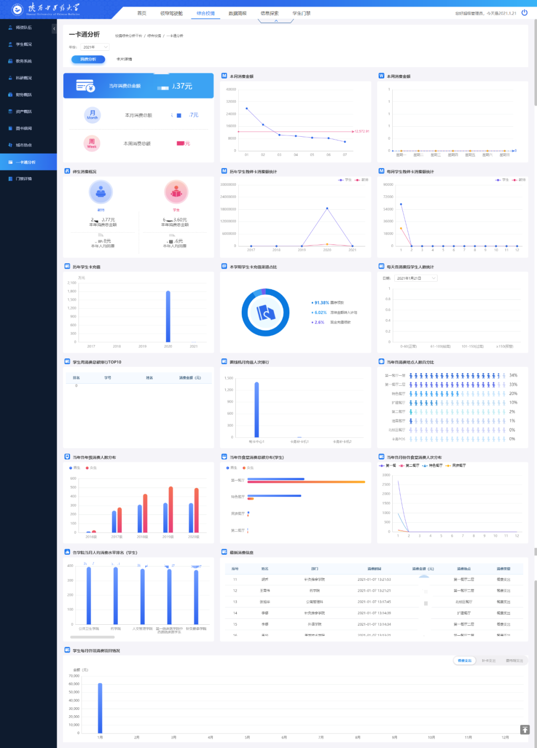 豐富的校情可視化數(shù)據(jù)看板 在綜合校情查詢與主題分析角度,對(duì)教務(wù)教學(xué)、科研、資產(chǎn)、財(cái)務(wù)、人事與學(xué)生管理、一卡通等業(yè)務(wù),進(jìn)行結(jié)構(gòu)、趨勢(shì)、分布等綜合分析,讓各級(jí)領(lǐng)導(dǎo)一屏在手,掌握全局,多種指標(biāo)實(shí)時(shí)隨地呈現(xiàn),助力科學(xué)決策。 師資隊(duì)伍 高校師資隊(duì)伍建設(shè)的優(yōu)劣決定了高校人才培養(yǎng)質(zhì)量的高低。如何在大數(shù)據(jù)時(shí)代科學(xué)利用源于高校各個(gè)層面的海量數(shù)據(jù),并使之成為高校師資隊(duì)伍建設(shè)的參考與方向,是眾多高校需要解決的問題。師資隊(duì)伍頁面通過展現(xiàn)教職工主要的屬性指標(biāo),分析了目前高校師資隊(duì)伍建設(shè)中所存在的問題,對(duì)加強(qiáng)高校師資隊(duì)伍建設(shè)起到指導(dǎo)作用。如下圖: 學(xué)生概括 學(xué)生概括展現(xiàn)出學(xué)生的基本屬性、人數(shù)分布、學(xué)籍情況、借閱與消費(fèi)、畢業(yè)與就業(yè)等指標(biāo)。如下圖: 資產(chǎn)分析 強(qiáng)化資產(chǎn)管理是推進(jìn)預(yù)算制度改革的重要內(nèi)容,也是部門預(yù)算有效執(zhí)行的重要保證。資產(chǎn)概括頁面通過分析學(xué)校各類型資產(chǎn)的存量和分布情況,可以提高資產(chǎn)的利用率,從而指導(dǎo)探索進(jìn)一步管好用好高校資產(chǎn)的方法與途徑。如下圖: 圖書借閱 對(duì)陜西中醫(yī)藥大學(xué)圖書館館藏圖書的種數(shù)、冊(cè)數(shù),以及圖書借閱率,不同用戶群借閱情況進(jìn)行了統(tǒng)計(jì),通過對(duì)統(tǒng)計(jì)數(shù)據(jù)的分析找出了圖書流通的一般規(guī)律,為今后館藏資源的配置、布局以及流通閱覽服務(wù)工作的完善提供參考。如下圖: 一卡通分析 一卡通分析頁面通過對(duì)全校師生消費(fèi)和卡片進(jìn)行分析,可以讓學(xué)校管理者對(duì)在校師生的消費(fèi)情況和規(guī)律有一個(gè)量化的認(rèn)識(shí),從而能夠合理地分配資源,降低管理成本,這對(duì)校園的規(guī)劃建設(shè)和學(xué)校學(xué)生管理工作都具有重要的作用。如下圖: 多層級(jí)的權(quán)限管理 億信ABI搭建的校情綜合分析平臺(tái),系統(tǒng)主要分五種類型用戶:學(xué)校領(lǐng)導(dǎo)、行政部門領(lǐng)導(dǎo)、教學(xué)部門領(lǐng)導(dǎo)、行政部門老師和教學(xué)部門老師。用戶根據(jù)不同的角色具有不同的權(quán)限 ,看到的信息也不同。