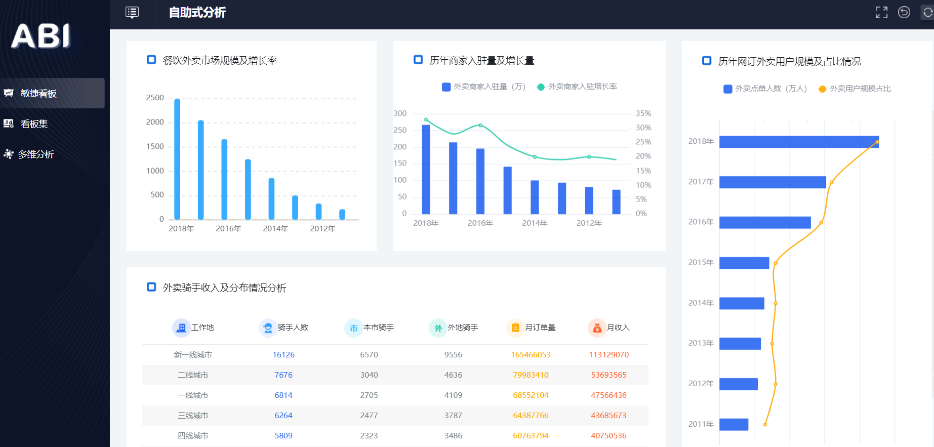 在互聯(lián)網(wǎng)、大數(shù)據(jù)等信息技術(shù)迅猛發(fā)展的當(dāng)下,我們迎來(lái)了大數(shù)據(jù)時(shí)代。與此同時(shí),數(shù)字經(jīng)濟(jì)的快速發(fā)展不斷催生新產(chǎn)業(yè)新業(yè)態(tài)新模式,正成為經(jīng)濟(jì)社會(huì)發(fā)展的新動(dòng)能。數(shù)據(jù)已經(jīng)成為繼土地、勞動(dòng)力、資本、技術(shù)之后的第五大生產(chǎn)要素,大數(shù)據(jù)這個(gè)詞在互聯(lián)網(wǎng)時(shí)代也變得越來(lái)越熱門。 2016年中國(guó)網(wǎng)約車大戰(zhàn)滴滴和優(yōu)步開(kāi)始爭(zhēng)奪中國(guó)網(wǎng)約車市場(chǎng)。這一大戰(zhàn)從2014年到2016年末持續(xù)了近兩年,滴滴和優(yōu)步分別開(kāi)啟補(bǔ)貼搶人,一再的降價(jià)、補(bǔ)貼和發(fā)券留住用戶,僅2015年兩者就虧損超過(guò)200億。最終,滴滴宣布收購(gòu)Uber,至此,滴滴在網(wǎng)約車領(lǐng)域一家獨(dú)大。 為什么滴滴和優(yōu)步背后的資本虧損如此之大都還要堅(jiān)持這場(chǎng)網(wǎng)約車大戰(zhàn)?答案只有一個(gè),就是數(shù)據(jù)。滴滴能夠?yàn)橘Y本提供的數(shù)據(jù)是海量而且細(xì)致的,能夠產(chǎn)生的價(jià)值是無(wú)法估量的,所以雙方都要爭(zhēng)奪這個(gè)市場(chǎng)。 那么大數(shù)據(jù)到底是什么呢?大數(shù)據(jù)有什么用,大數(shù)據(jù)有什么價(jià)值?接下來(lái)小億和大家一起來(lái)看看。 一、什么是大數(shù)據(jù)? 大數(shù)據(jù)和數(shù)據(jù)之間就差一個(gè)“大”字,那么大數(shù)據(jù)就是大量的數(shù)據(jù)嗎?其實(shí)并不是。 目前關(guān)于大數(shù)據(jù)的概念眾說(shuō)紛紜,到目前為止,還沒(méi)有一個(gè)明確的統(tǒng)一的定義,不同組織機(jī)構(gòu)對(duì)大數(shù)據(jù)有著不同的描述。麥肯錫認(rèn)為,大數(shù)據(jù)是指大小超出了典型數(shù)據(jù)庫(kù)軟件的采集存儲(chǔ)管理和分析等能力的數(shù)據(jù)集。而維基百科給出的定義是,無(wú)法在一定時(shí)間內(nèi)使用常規(guī)的軟件工具,對(duì)其內(nèi)容進(jìn)行抓取管理和處理的大量而復(fù)雜的數(shù)據(jù)集合。 但不論哪一種描述,關(guān)于大數(shù)據(jù)的特征卻是一致公認(rèn)的。在早期就提出了一個(gè)縮寫詞來(lái)描述大數(shù)據(jù)特征,即“VVVV”。首先第一個(gè)V指的是Volume,容量。主要指非結(jié)構(gòu)化數(shù)據(jù)的規(guī)模和增長(zhǎng)速度。因?yàn)榉墙Y(jié)構(gòu)化數(shù)據(jù)占數(shù)據(jù)總量的80%到90%,同時(shí)也比結(jié)構(gòu)化數(shù)據(jù)增長(zhǎng)快十倍到50倍,并且數(shù)據(jù)量是傳統(tǒng)數(shù)據(jù)庫(kù)的十倍到50倍。第二個(gè)V指的是為Variety,多元化。主要指大數(shù)據(jù)的易構(gòu)和多樣性。數(shù)據(jù)有很多不同的形式,比如文本圖像視頻機(jī)器數(shù)據(jù)等等,這些數(shù)據(jù)大多是無(wú)模式或者是模式不明顯。第三個(gè)V值得是value,價(jià)值,主要體現(xiàn)在大量的不相關(guān),信息價(jià)值密度低,需要通過(guò)深度復(fù)雜分析,才可以對(duì)未來(lái)的趨勢(shì)和模式進(jìn)行預(yù)測(cè)。第四個(gè)V指的是Velocity高效。主要體現(xiàn)在實(shí)時(shí)分析,實(shí)時(shí)呈現(xiàn)分析結(jié)果。 二、大數(shù)據(jù)有什么用? 當(dāng)人們談?wù)摯髷?shù)據(jù)時(shí),他們?cè)谡勈裁矗? 大數(shù)據(jù)的火熱應(yīng)用滲透進(jìn)了各行各業(yè),但很少有人能夠真正認(rèn)識(shí)到大數(shù)據(jù)的核心意義所在,可以說(shuō)在現(xiàn)在的時(shí)代,數(shù)據(jù)驅(qū)動(dòng)發(fā)展一點(diǎn)也不為過(guò),那我們一起來(lái)看看大數(shù)據(jù)究竟有什么用? 1、大數(shù)據(jù)的處理分析將成為信息技術(shù)融合發(fā)展的新節(jié)點(diǎn)。 移動(dòng)互聯(lián)網(wǎng)、物聯(lián)網(wǎng)、社交網(wǎng)絡(luò)、數(shù)字家庭、電子商務(wù)等是新一代信息技術(shù)的應(yīng)用形態(tài),這些應(yīng)用不斷產(chǎn)生大數(shù)據(jù)。云計(jì)算為這些海量、多樣化的大數(shù)據(jù)提供存儲(chǔ)和運(yùn)算平臺(tái)。通過(guò)對(duì)不同來(lái)源數(shù)據(jù)的管理、處理、分析與優(yōu)化,將結(jié)果反饋到上述應(yīng)用中,將創(chuàng)造出巨大的經(jīng)濟(jì)和社會(huì)價(jià)值。大數(shù)據(jù)具有催生社會(huì)變革的能量。但釋放這種能量,需要嚴(yán)謹(jǐn)?shù)臄?shù)據(jù)治理、富有洞見(jiàn)的數(shù)據(jù)分析和激發(fā)管理創(chuàng)新的環(huán)境。 有了數(shù)據(jù)還要對(duì)數(shù)據(jù)進(jìn)行分析,恰好億信華辰研發(fā)的BI工具億信ABI就能很好的做到這一點(diǎn)。億信ABI打通了從數(shù)據(jù)接入、到數(shù)據(jù)建模與處理、再到數(shù)據(jù)分析與挖掘整個(gè)數(shù)據(jù)應(yīng)用全鏈路,可滿足企業(yè)經(jīng)營(yíng)中各類復(fù)雜的分析需求,幫助企業(yè)實(shí)現(xiàn)高效數(shù)字化轉(zhuǎn)型。 2、大數(shù)據(jù)是信息產(chǎn)業(yè)持續(xù)高速增長(zhǎng)的新引擎。 面向大數(shù)據(jù)市場(chǎng)的新技術(shù)、新產(chǎn)品、新服務(wù)、新業(yè)態(tài)會(huì)不斷涌現(xiàn)。在硬件與集成設(shè)備領(lǐng)域,大數(shù)據(jù)將對(duì)芯片、存儲(chǔ)產(chǎn)業(yè)產(chǎn)生重要影