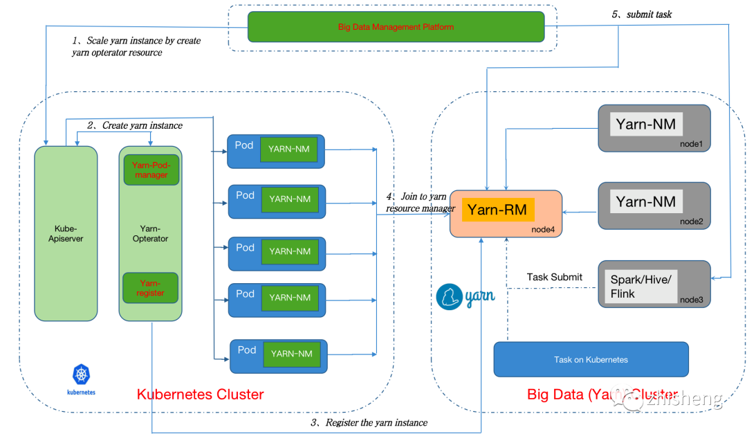 首先,統(tǒng)一在離線的集群管理器是混部的基礎(chǔ)。目前大多數(shù)公司是 k8s 與 YARN 并存的狀態(tài),但在云原生的大趨勢(shì)下,大數(shù)據(jù)組件也逐步對(duì) k8s 提供頭等的支持,看起來(lái) k8s 一統(tǒng)集群資源只是時(shí)間問(wèn)題。不過(guò) k8s 的要做到這點(diǎn)也絕非一路平坦,一是 k8s 的一級(jí)調(diào)度設(shè)計(jì)并不能很好地滿足很多批計(jì)算作業(yè)的復(fù)雜調(diào)度,二是 k8s 當(dāng)前能掌控的集群規(guī)模一般在 5000 節(jié)點(diǎn)左右,比起 YARN 差了一個(gè)量級(jí)[11]。因此在當(dāng)前階段,業(yè)界大多是選擇 YARN on k8s 的方式來(lái)漸進(jìn)式地遷移。常見(jiàn)的做法是在 k8s pod 里啟動(dòng) NM,讓 YARN 部分 NM 節(jié)點(diǎn)運(yùn)行在 k8s 上。