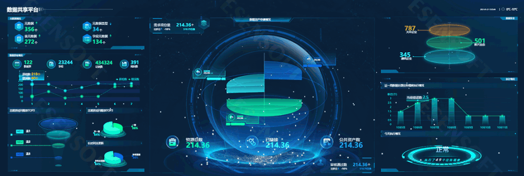 —TOP 2— 法制宣傳大屏 最佳分辨率:1920*1080 使用場景:了解普法工作的推進情況,包括隊伍建設(shè)、媒體宣傳、各個縣市的大數(shù)據(jù)對比等,對于有法制宣傳,法律服務(wù)等需求的行業(yè)提供大屏承載方案,助其成為暢通社情民意、服務(wù)保障民生的監(jiān)管新陣地。 展現(xiàn)邏輯:使用樣式各異的圖表,展示法律行業(yè)內(nèi)的不同需求的數(shù)據(jù),根據(jù)地理位置等信息數(shù)據(jù),直觀、便捷的展現(xiàn)數(shù)據(jù)結(jié)果,讓人一目了然。 —TOP 3— 數(shù)據(jù)共享大屏 最佳分辨率:4800*1620 使用場景:將數(shù)據(jù)集中到數(shù)據(jù)共享平臺,實現(xiàn)多數(shù)據(jù)源管理,透明化的服務(wù)支持,使得數(shù)據(jù)資源可觀、可感、可控,智能化的提出數(shù)據(jù)共享側(cè)的建議。最終,加強決策和預(yù)測能力從而提升公司整體數(shù)據(jù)管理水平。 展現(xiàn)邏輯:實時展示數(shù)據(jù)資產(chǎn)申請情況、元數(shù)據(jù)情況、數(shù)據(jù)質(zhì)檢情況、數(shù)據(jù)安全、執(zhí)行情況等信息,并添加大量的動畫效果使其充滿科幻感。