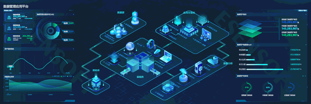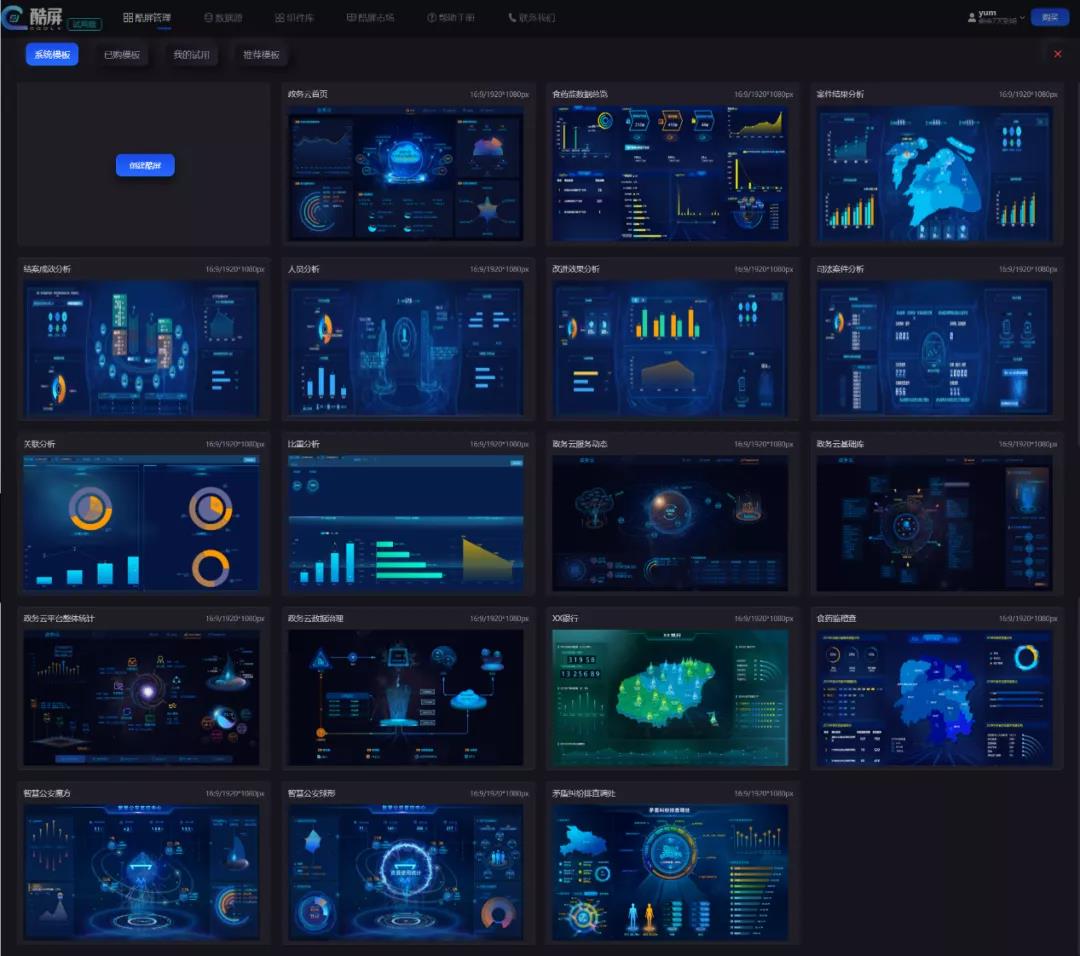 別急,稱得上是可視化領(lǐng)域的種子選手:億信ABI的大屏模塊——酷屏帶著一籮筐解決方法來了,該系統(tǒng)內(nèi)置18套精美且免費的大屏模板,用戶可一鍵套用,助您快速高效地制作出酷炫大屏。 如果還“不滿足”,咱們酷屏市場還會定期更新時下最酷最I(lǐng)N的模板與組件,用戶可自行試用和購買。今天小億給大家分享酷屏市場中最受歡迎的5套模板,來看看這些“高顏值”模板的應(yīng)用場景吧,文末有獲取鏈接哦! —TOP 1— 數(shù)據(jù)管理應(yīng)用大屏 最佳分辨率:4800*1620 使用場景:精準(zhǔn)對接政企的數(shù)據(jù)治理的可視化需求,利用動態(tài)的圖表將數(shù)據(jù)的流轉(zhuǎn)狀態(tài)清晰展示,明確數(shù)據(jù)治理的路徑和流程。另外,各個部門的數(shù)據(jù)資產(chǎn)使用狀況和資源利用率得以清晰地展現(xiàn),對于管理者來說可以及時并針對性的提出解決方案。 展現(xiàn)邏輯:中心以動畫效果展示數(shù)據(jù)管理應(yīng)用的整個流程,實時展示數(shù)據(jù)接入情況、數(shù)據(jù)增長趨勢、數(shù)據(jù)資產(chǎn)概況等信息。